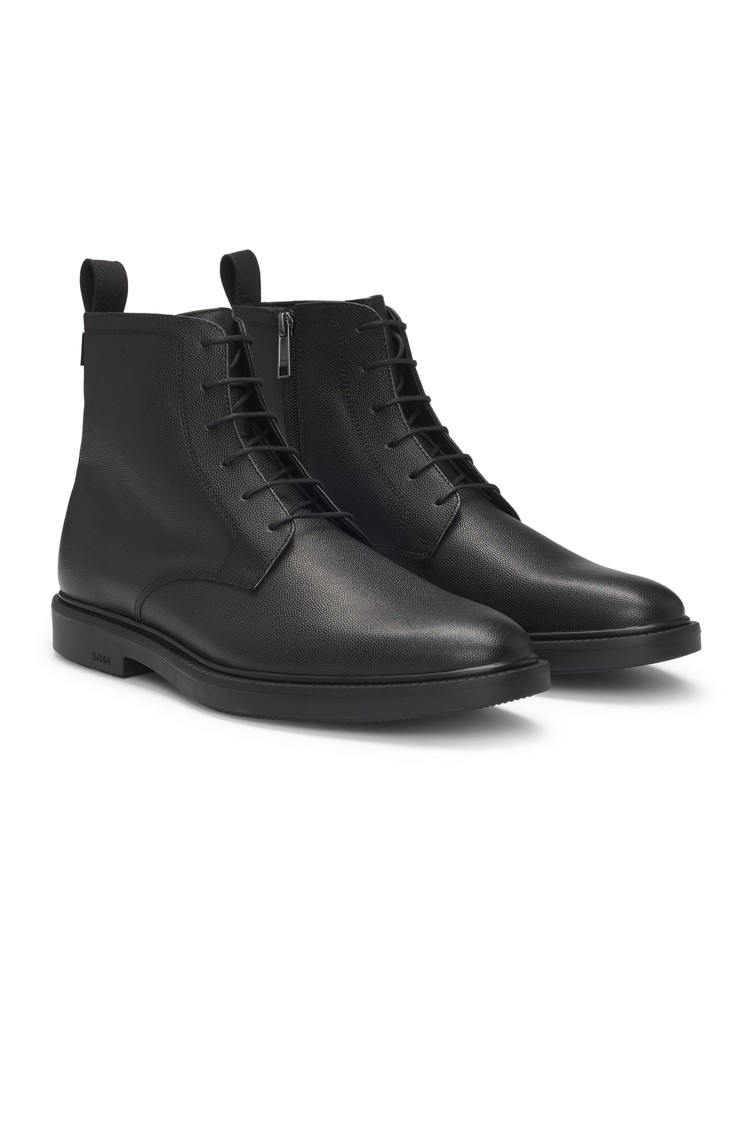 Lace-up half boots in printed leather by BOSS Menswear. This pair has blind eyelets and a rubber outsole. BOSS continuously looks for more responsible ways to produce and finish their products. A minimum of 60% of the leather used to make this product has been sourced from certified tanneries.