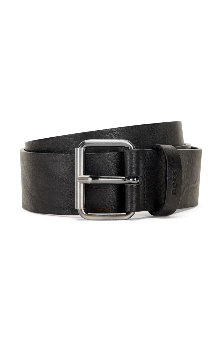 A contemporary belt by BOSS. Crafted in finest Italian leather that has been tanned with natural substances, this belt secures with a roller buckle in a matte gunmetal effect. The leather keeper is stamped with a BOSS logo.