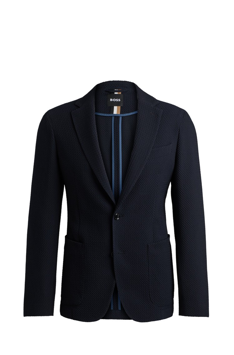 A contemporary jacket with a soft shoulder construction, by BOSS Menswear. This slim-fit blazer is crafted in seersucker fabric made from a wool blend.