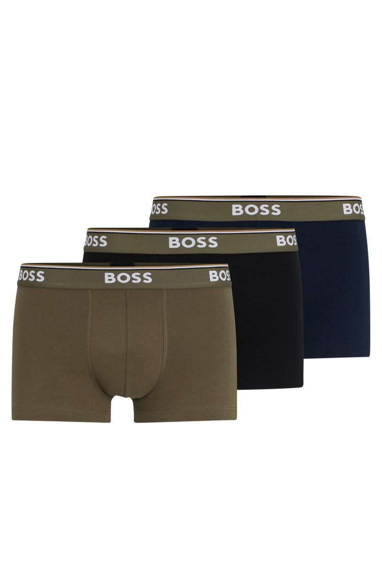 Three pairs of regular-rise trunks in stretch cotton with branded waistbands and signature-stripe details by BOSS.