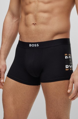 Two pairs of regular-rise trunks by BOSS, both made in stretch cotton with branded waistbands and one featuring logo artwork at the left leg.