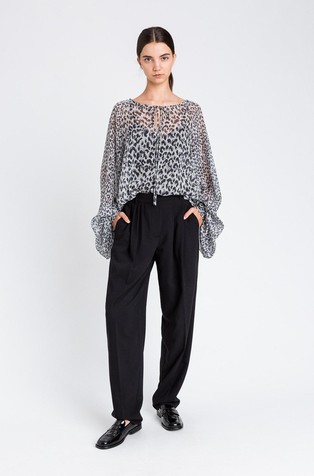 Stun them all when you wear this solid jersey t-shirt with pleated flounce in gorgette see-through rébrodé lace on the back. Its asymmetric hem will look fantastic with skinny jeans or leggings.