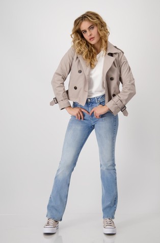 Kratek eleganten trenčkot navduši z epoleto na ramenih, nastavljivim paščkom na rokavih in straneh ter z brezčasnim dvorednim zapenjanjem.